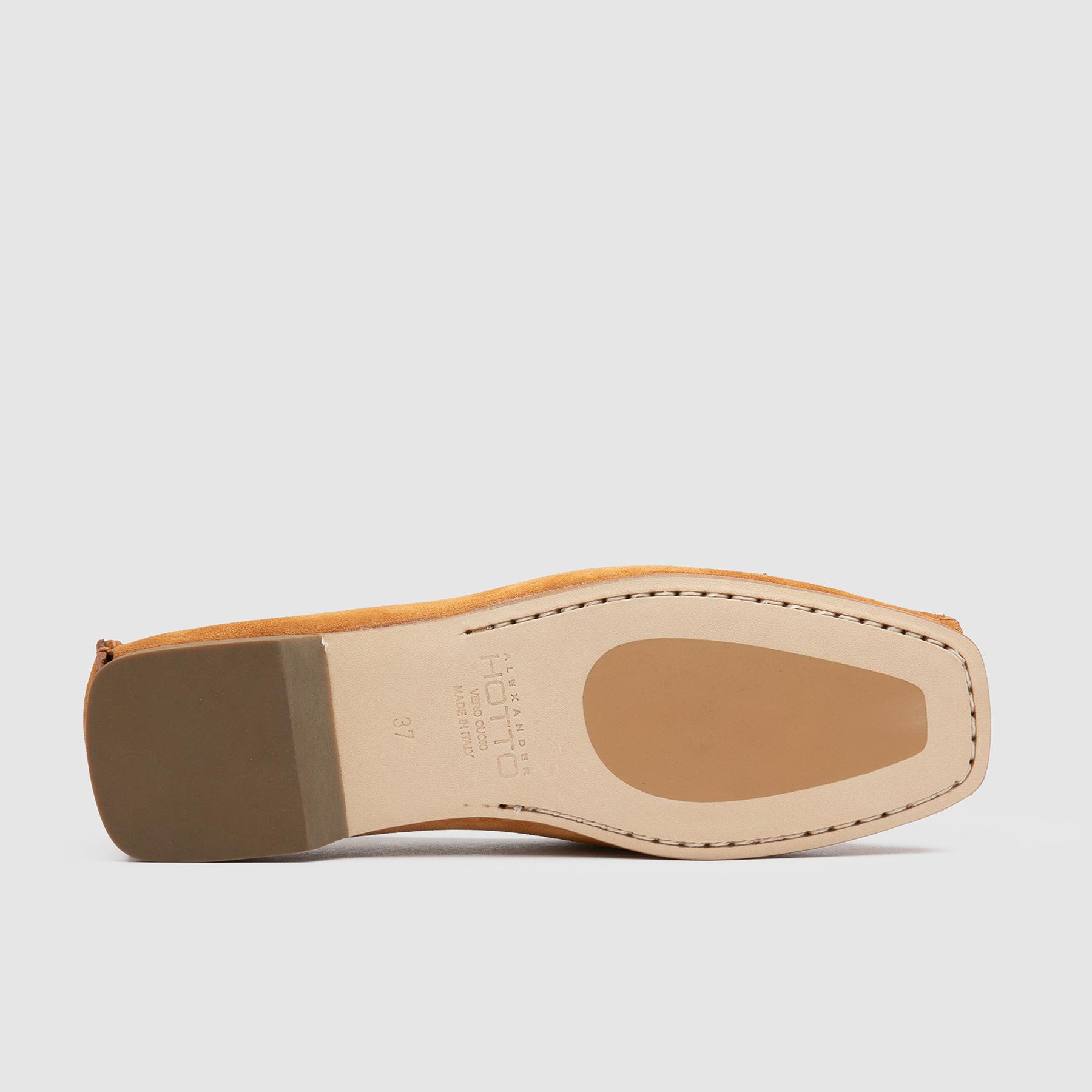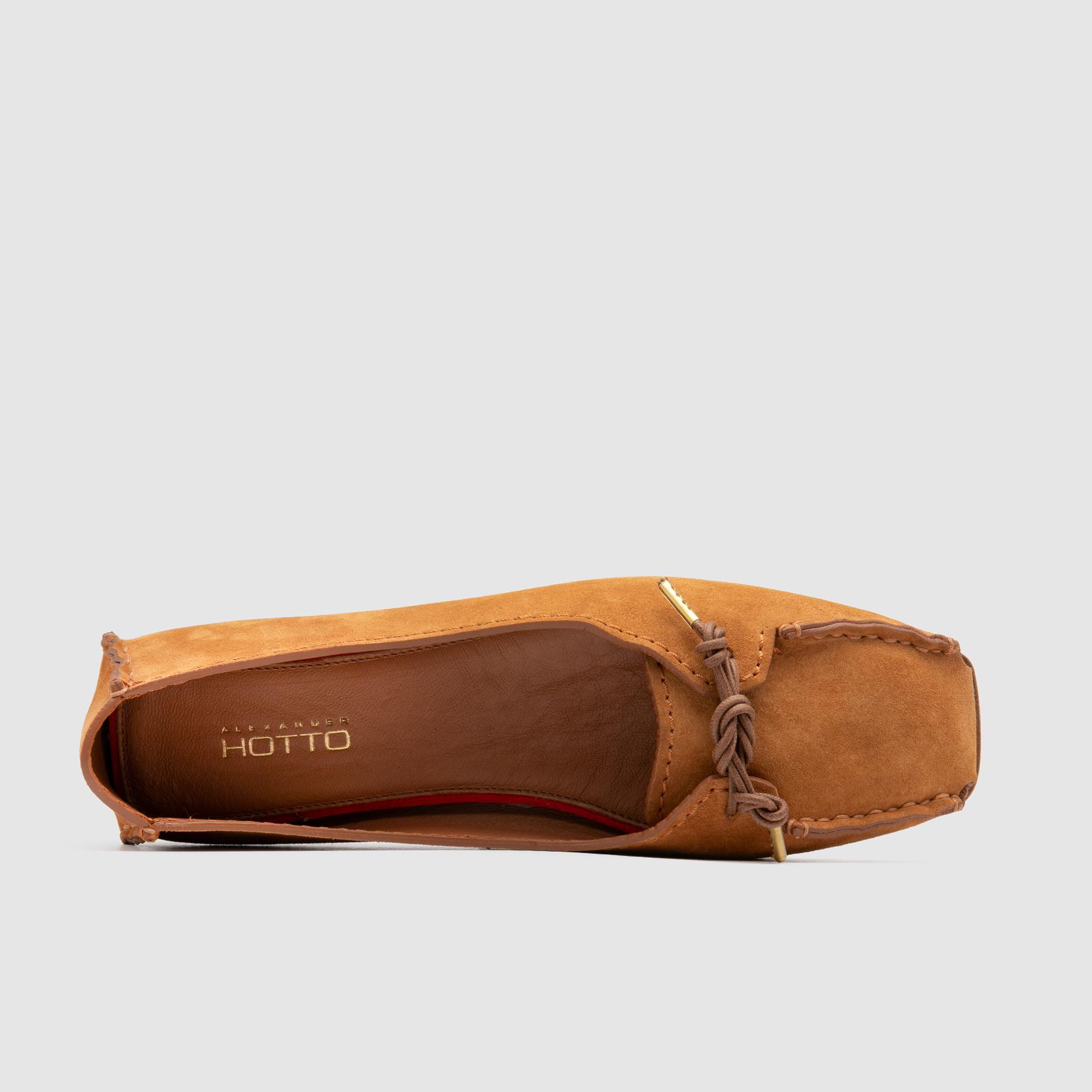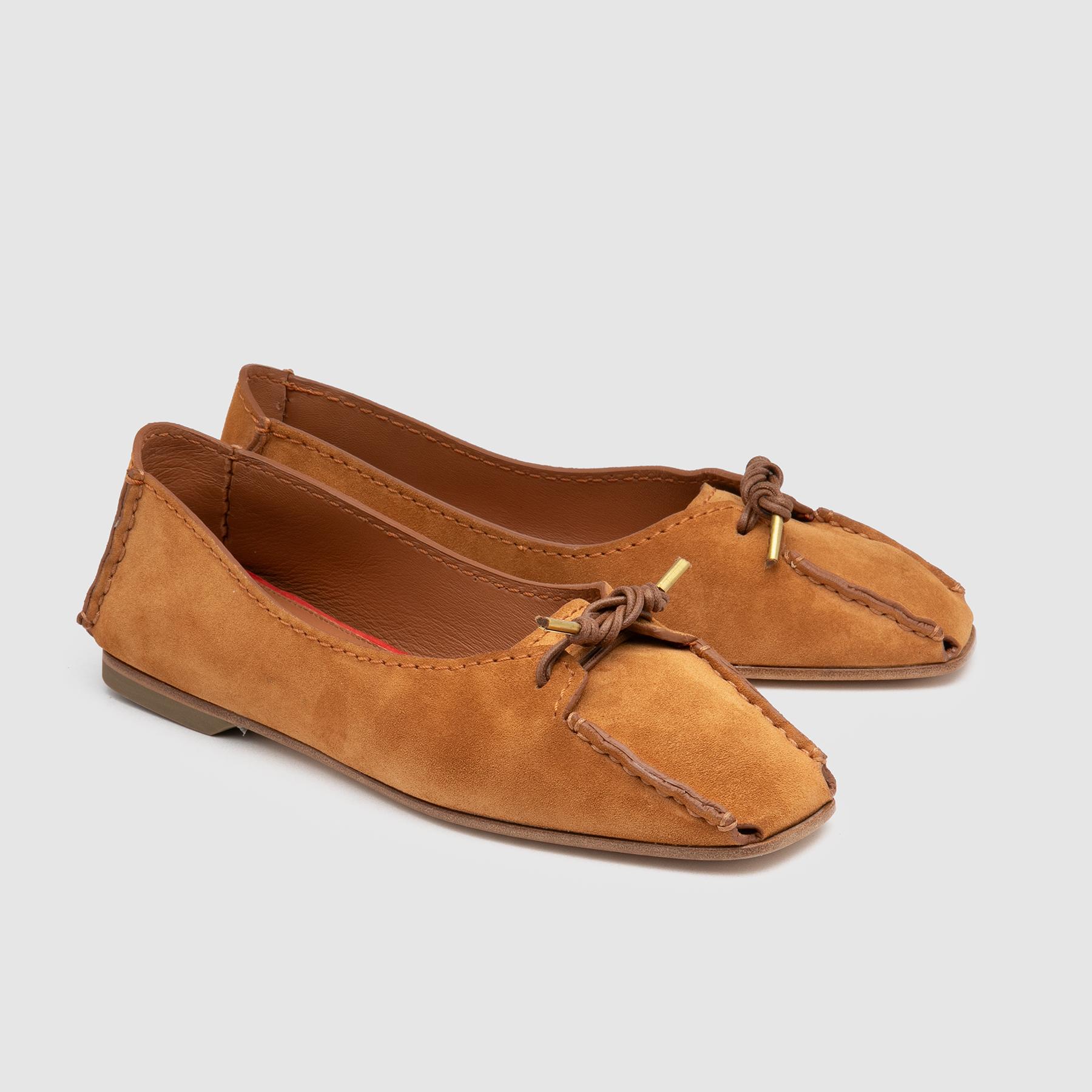 Ballerina da donna a in camoscio marrone, realizzata con pregiata lavorazione sacchetto per offrire estrema morbidezza e flessibilità. La tomaia in pelle scamosciata  conferisce un’eleganza leggera, mentre la struttura squadrata le dona un look contemporaneo. La mancanza di fodera garantisce leggerezza e comfort prolungato. All’interno, la soletta in pelle di agnello con logo stampato oro aggiunge un tocco di lusso e cura del dettaglio. I dettagli artigianali  ne valorizzano il design essenziale, rendendo questa ballerina perfetta per uno stile casual chic, elegante e versatile.