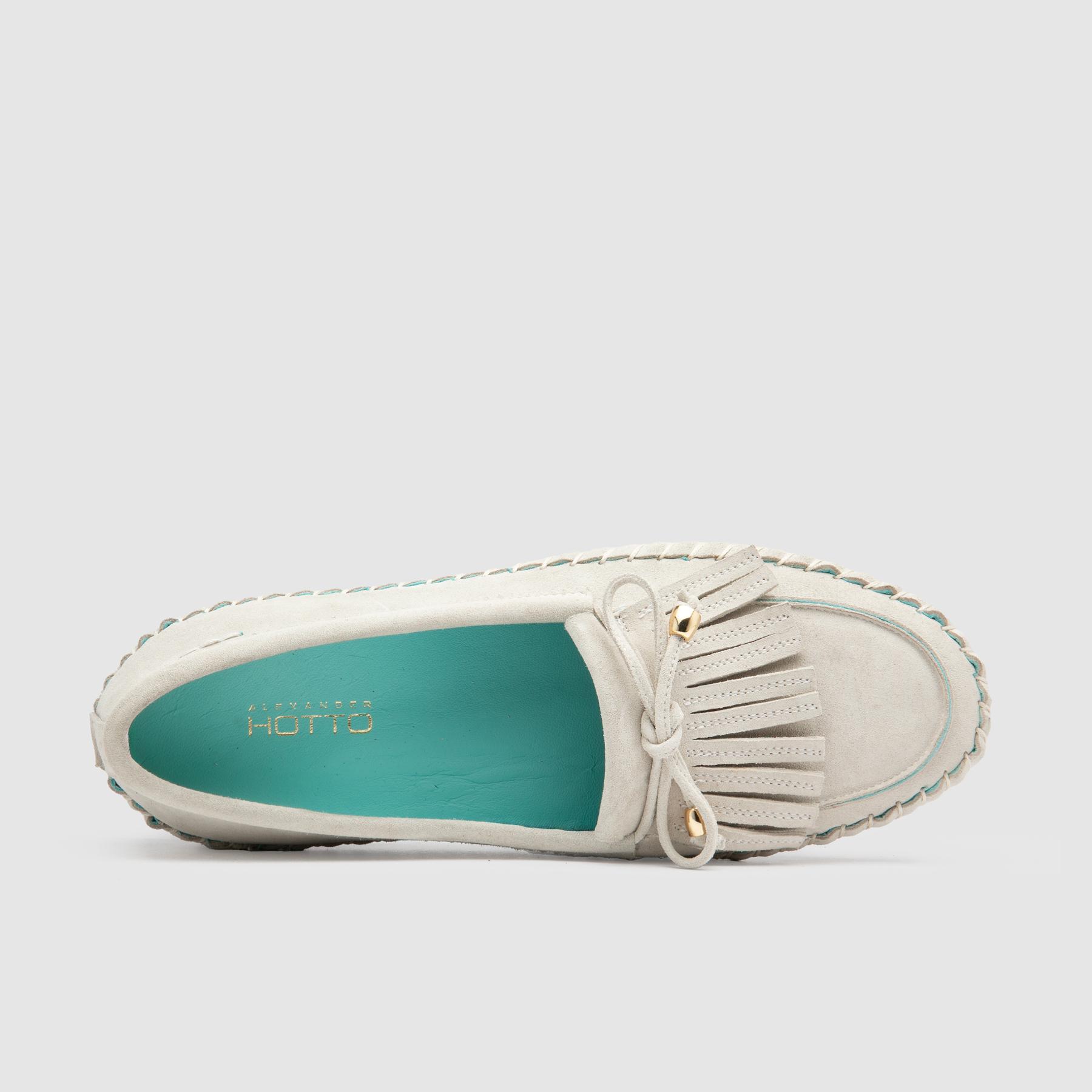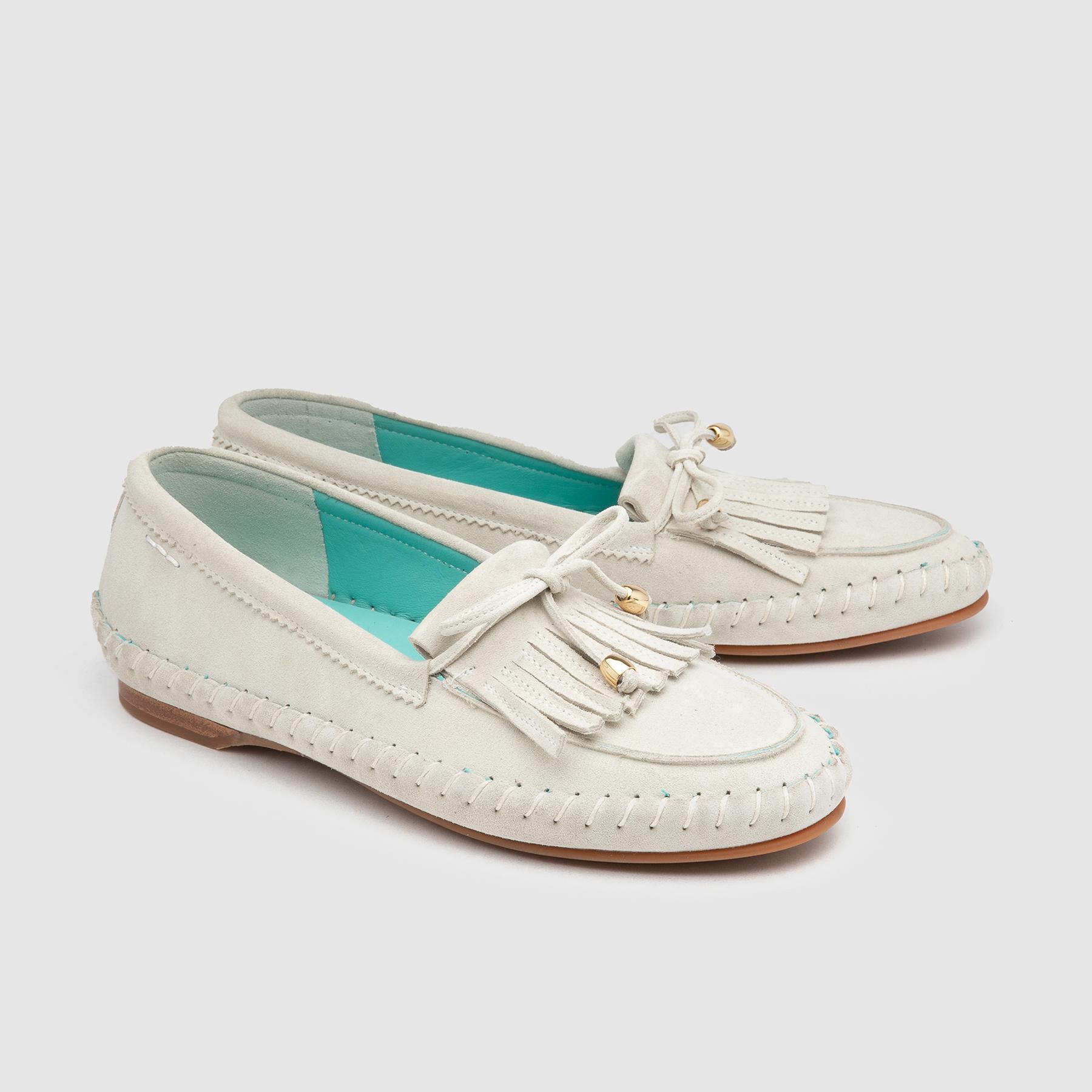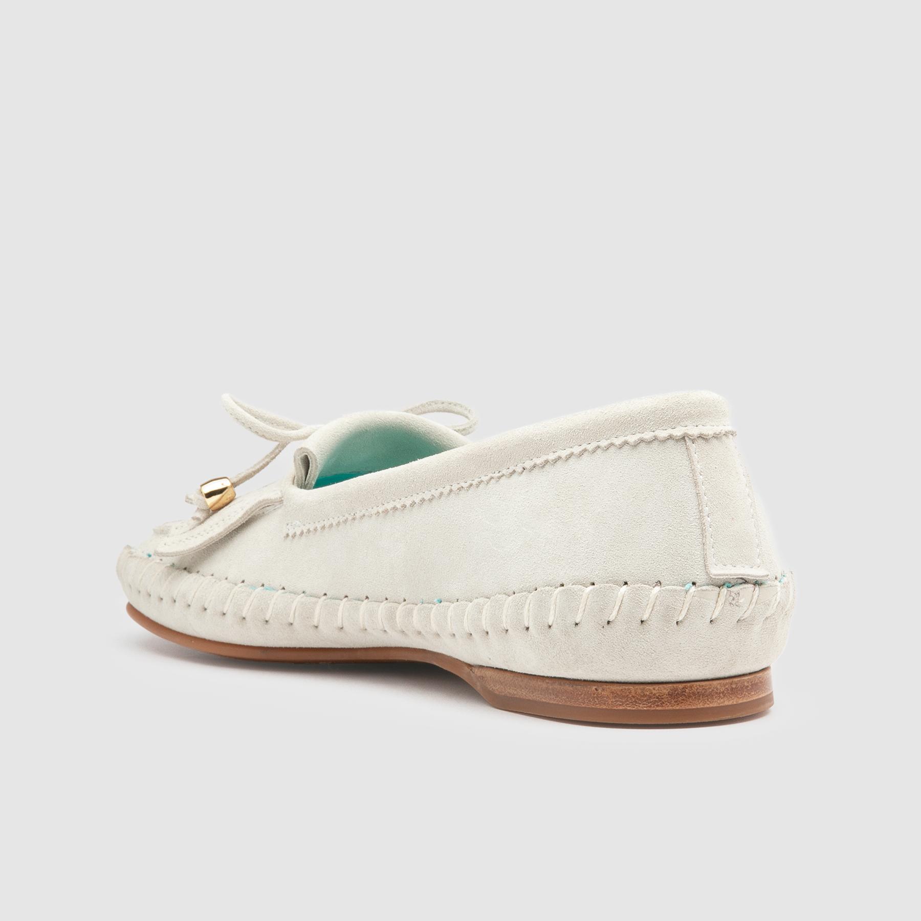 Raffinato ed essenziale, questo mocassino da donna in camoscio bianco è la scelta ideale per chi cerca comfort, qualità artigianale e stile senza tempo. Realizzato in morbido camoscio, presenta una lavorazione sacchetto che avvolge il piede come un guanto, garantendo massima flessibilità e una calzata naturale. Il design è impreziosito da frange decorative con fiocco e dettaglio metallico dorato, che aggiungono un tocco femminile ed elegante. Le cuciture a vista fatte a mano valorizzano l’artigianalità del modello, mentre la fodera interna in pelle color turchese dona freschezza e raffinatezza. La suola in gomma sottile assicura leggerezza e stabilità, rendendo questo mocassino perfetto sia per l’uso quotidiano che per occasioni più curate. Versatile e luminoso, è ideale da abbinare a jeans, pantaloni sartoriali o abiti primaverili ed estivi.