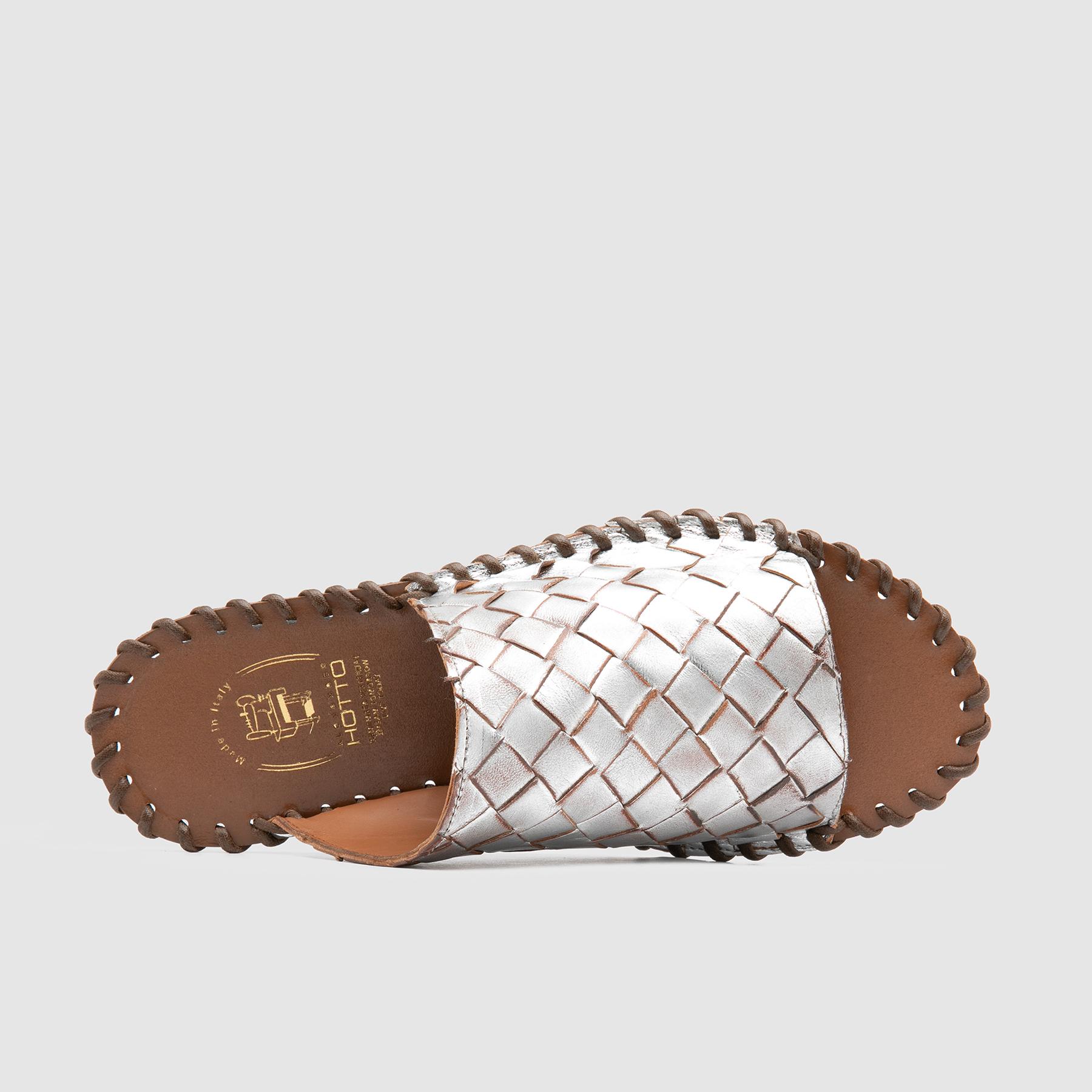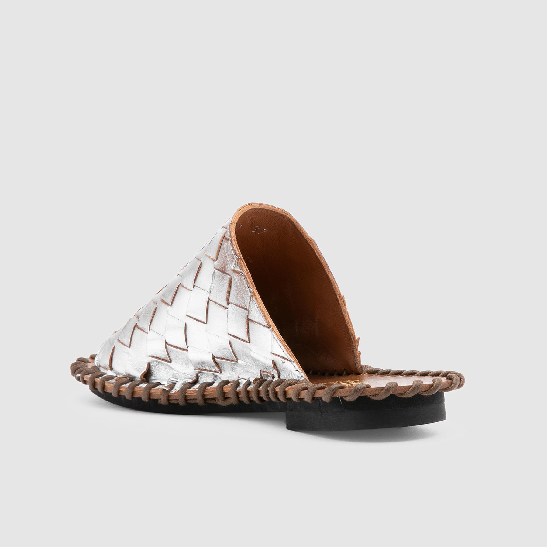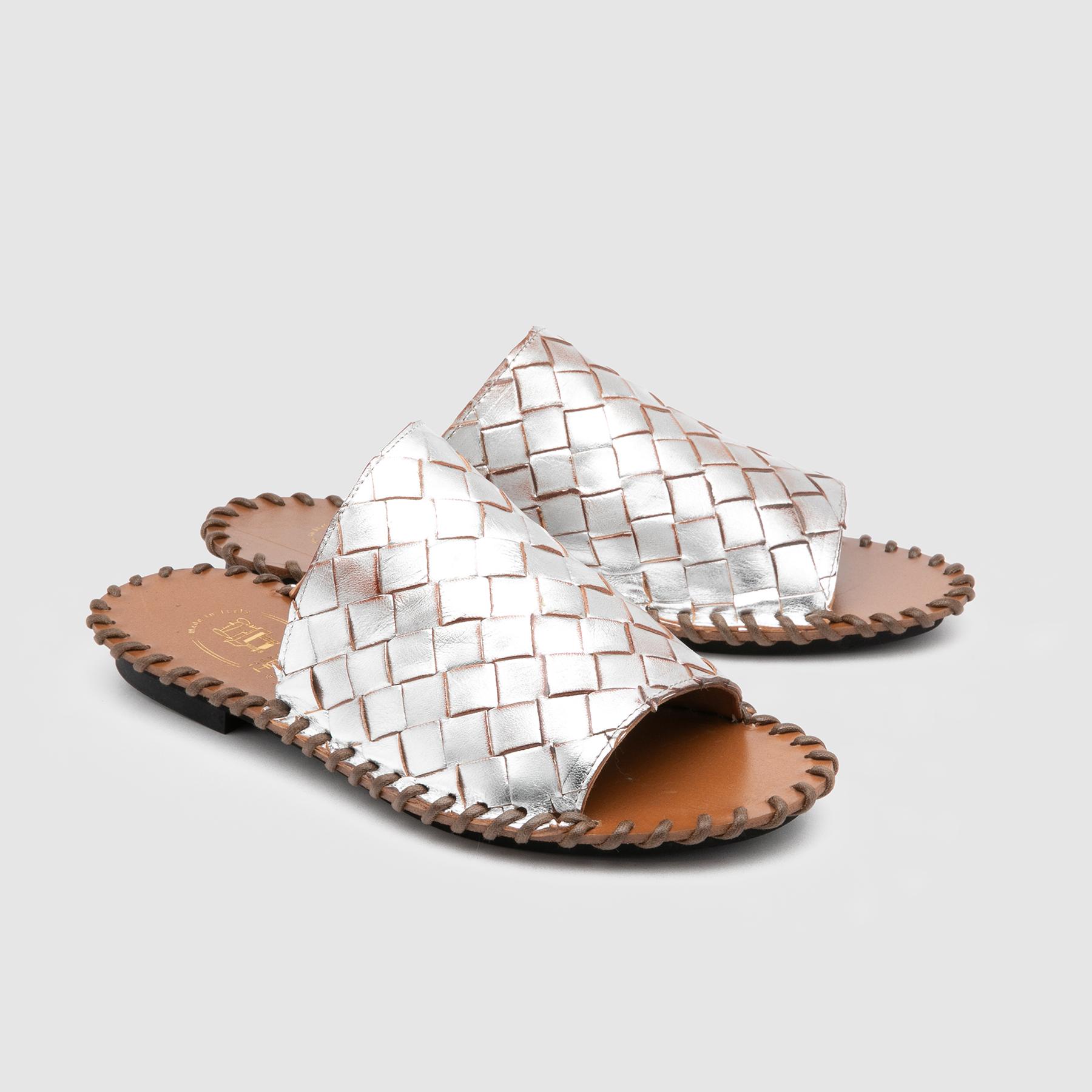 Women’s leather slippers with woven leather in a sophisticated, contemporary design, ideal for enhancing summer looks and sophisticated outfits. The soft, shiny silver lambskin upper features an elegant diagonal weave that adds movement and refinement to the shoe, enhancing its artisanal style.The brown lambskin lining ensures a comfortable and natural feel against the foot. The leather sole, enriched with a black rubber tread, guarantees durability, stability and practicality for everyday use, without compromising on aesthetics.The handcrafted stitching on the sole completes the model, adding quality and character. A slipper designed for those seeking elegance and fine materials in a summer shoe with a distinctive style.